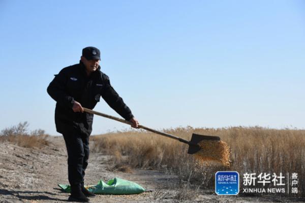 在天津北大港湿地自然保护区,野生鸟类保护员在鸟类出没的地带撒放玉米等谷物。新华社记者 张宇琪摄