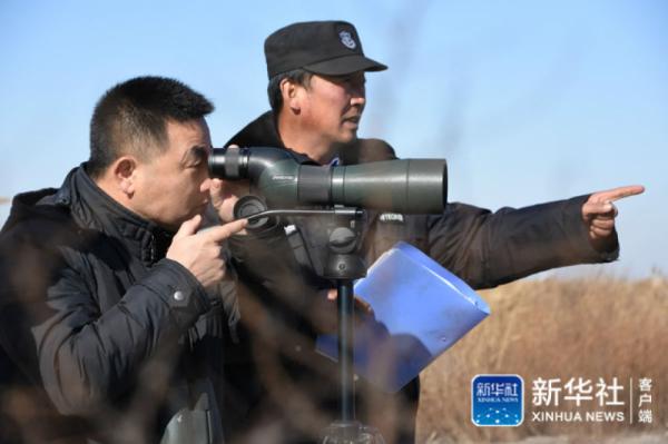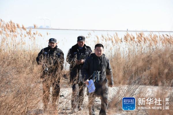 在天津北大港湿地自然保护区,野生鸟类保护员姚庆峰(右一)和同事一起对鸟类进行巡护。新华社记者 张宇琪摄