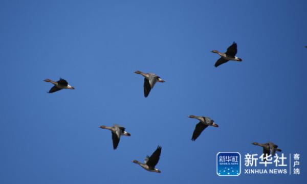 一群豆雁在天津北大港湿地自然保护区上空飞翔。新华社记者 张宇琪摄
