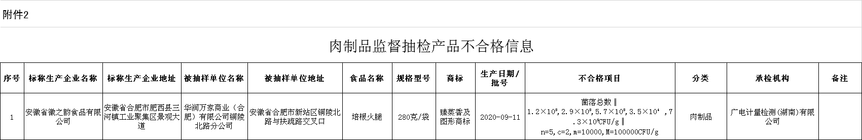 华润万家商业(合肥)有限公司铜陵北路分公司销售的、标称安徽省徽之韵食品有限公司(合肥)生产的培根火腿,菌落总数不符合食品安全国家标准。检验机构为广电计量检测(湖南)有限公司。