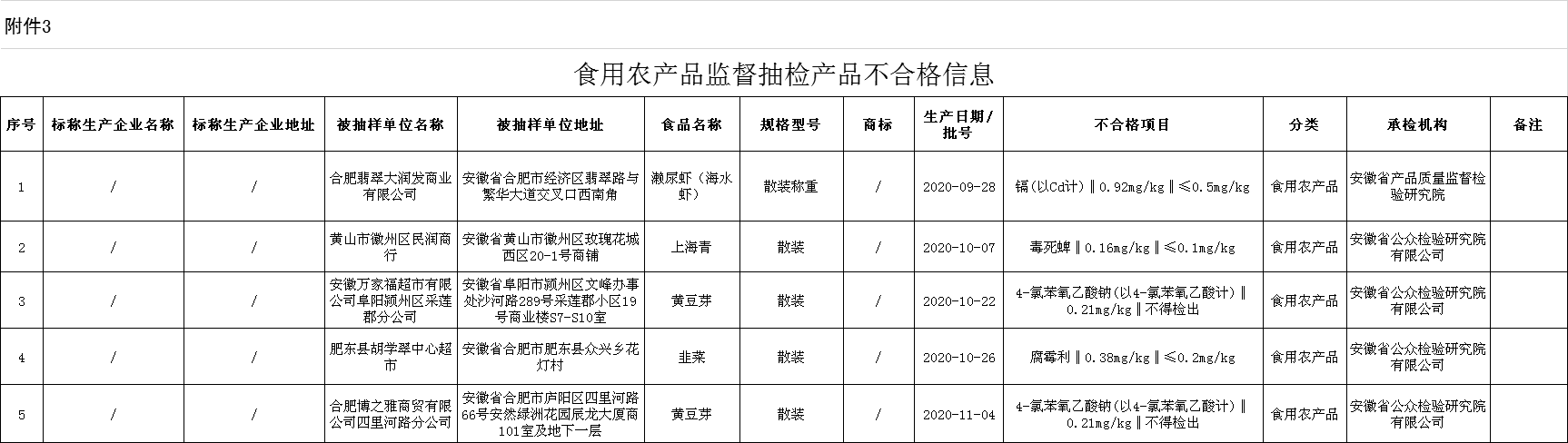 (三)合肥市肥东县胡学翠中心超市销售的韭菜,腐霉利不符合食品安全国家标准。检验机构为安徽省公众检验研究院有限公司。