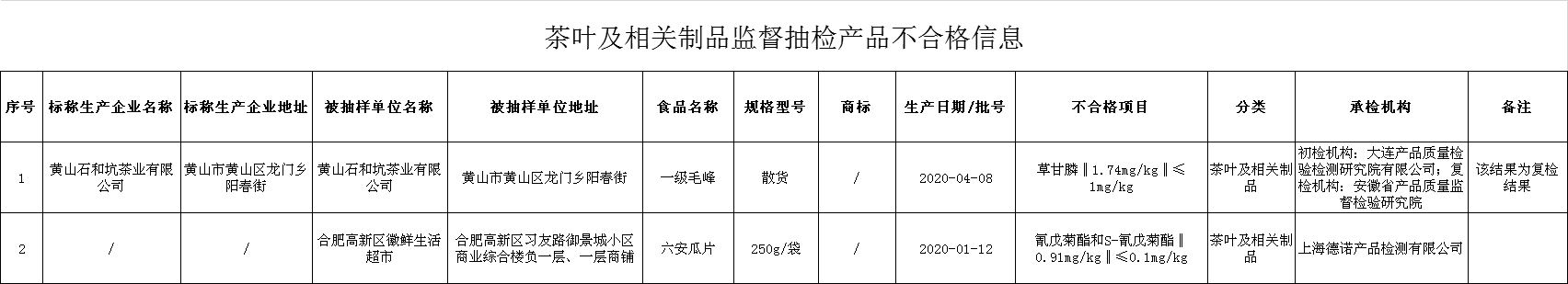 (二)合肥高新区徽鲜生活超市销售的六安瓜片,氰戊菊酯和S-氰戊菊酯不符合食品安全国家标准。检验机构为上海德诺产品检测有限公司。