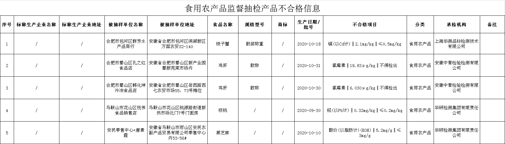(一)合肥市包河区群芳水产品商行销售的梭子蟹,镉(以Cd计)不符合食品安全国家标准。检验机构为上海华测品标检测技术有限公司。