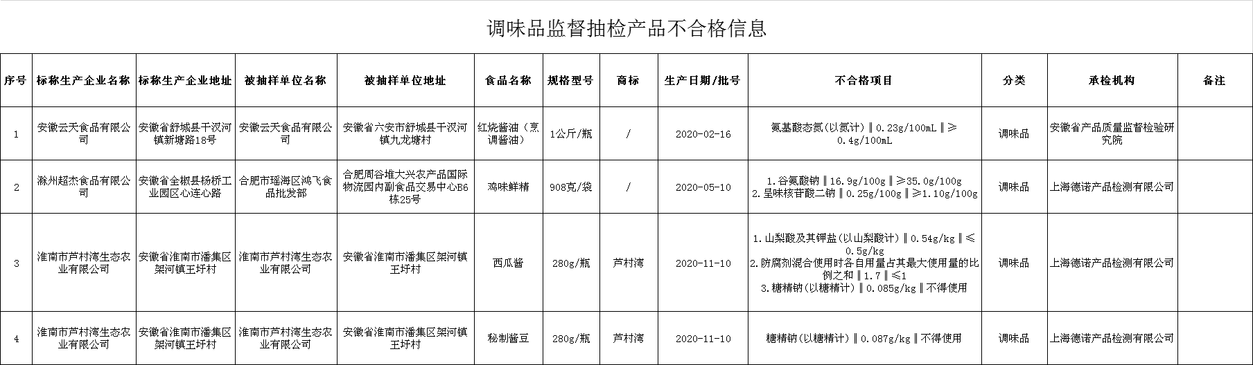 6月16日,安徽省市场监督管理局发布公告,组织抽检调味品、糕点、食用农产品、粮食加工品、饮料等5类食品307批次样品。根据食品安全国家标准检验和判定,其中抽样检验项目合格样品302批次、不合格样品5批次,不合格样品涉及质量指标、食品添加剂等问题。
