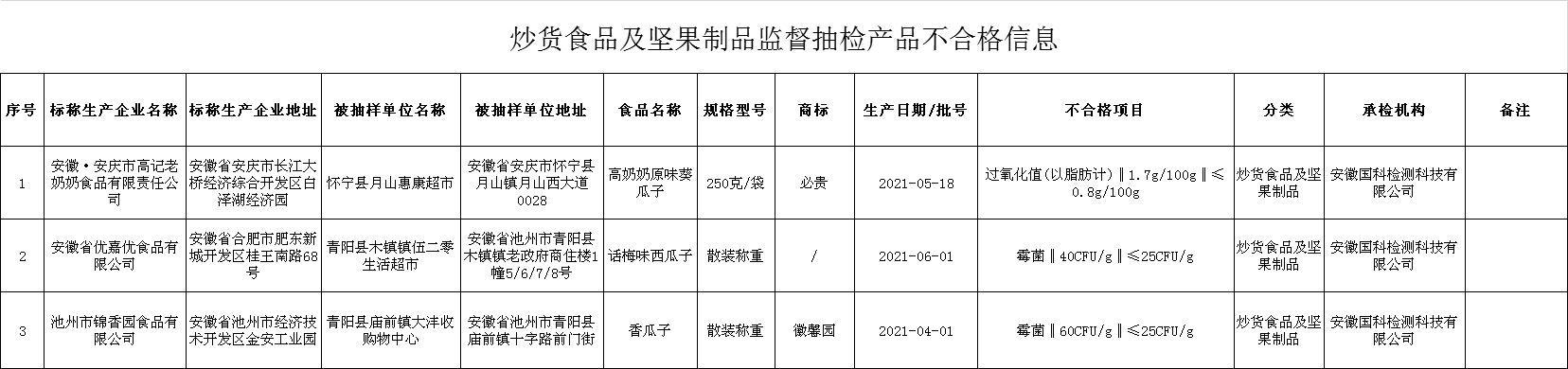 (二)池州市青阳县庙前镇大沣收购物中心销售的、标称池州市锦香园食品有限公司生产的香瓜子,霉菌不符合食品安全国家标准。检验机构为安徽国科检测科技有限公司。