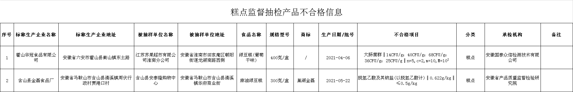 (三)江苏苏果超市有限公司淮南分公司销售的、标称六安市霍山华冠食品有限公司生产的绿豆糕(葡萄干味),大肠菌群不符合食品安全国家标准。检验机构为安徽国泰众信检测技术有限公司。