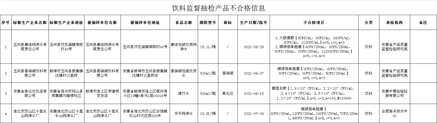 (四)标称蚌埠市五河县康洁纯净水有限责任公司生产的康洁包装饮用纯净水,大肠菌群、铜绿假单胞菌均不符合食品安全国家标准。检验机构为安徽省产品质量监督检验研究院。
