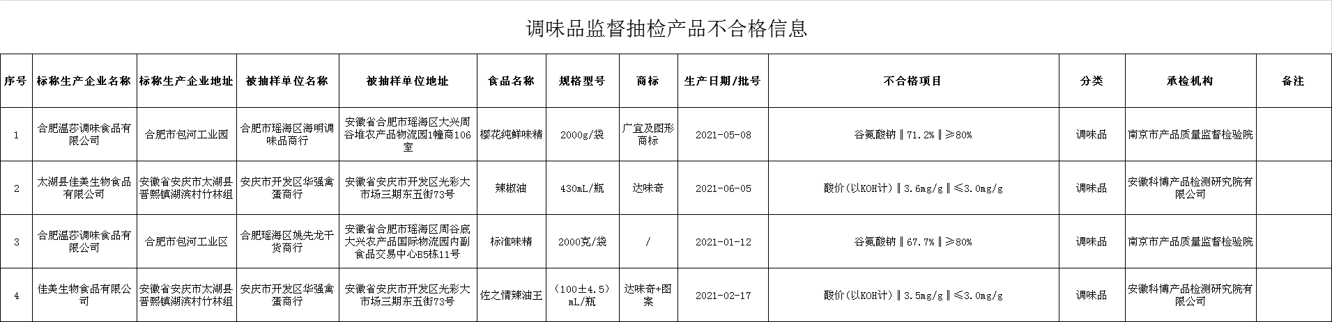 (四)安庆市开发区华强禽蛋商行销售的、标称佳美生物食品有限公司(安庆)生产的佐之情辣油王,酸价(以KOH计)不符合产品明示标准和质量要求。检验机构为安徽科博产品检测研究院有限公司。