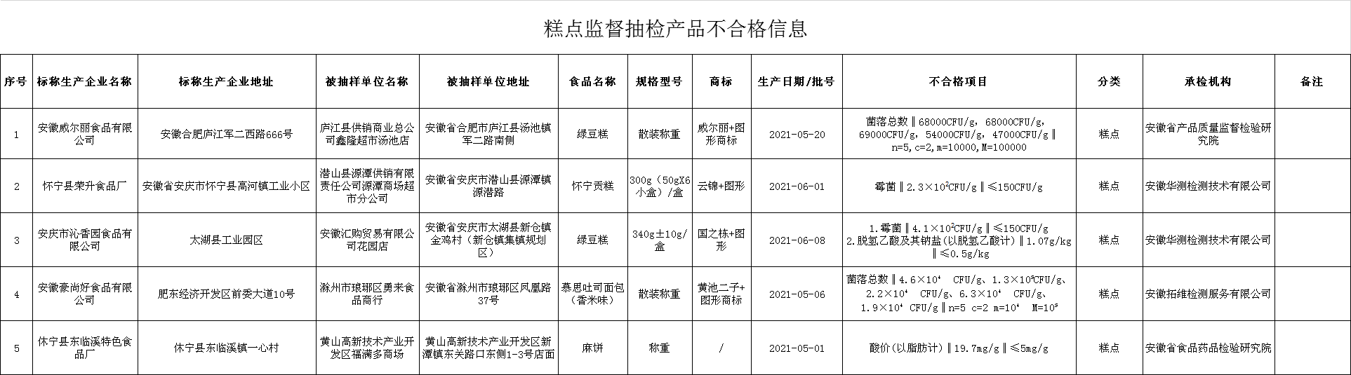 (三)安徽汇购贸易有限公司花园店(安庆)销售的、标称安庆市沁香园食品有限公司生产的绿豆糕,霉菌、脱氢乙酸及其钠盐(以脱氢乙酸计)均不符合食品安全国家标准。检验机构为安徽华测检测技术有限公司。