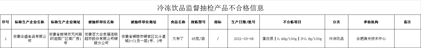 (五)安徽百大合家福连锁超市股份有限公司铜陵分公司销售的、标称安徽合盛食品有限公司(蚌埠)生产的大布丁,蛋白质不符合食品安全国家标准。检验机构为合肥海关技术中心。