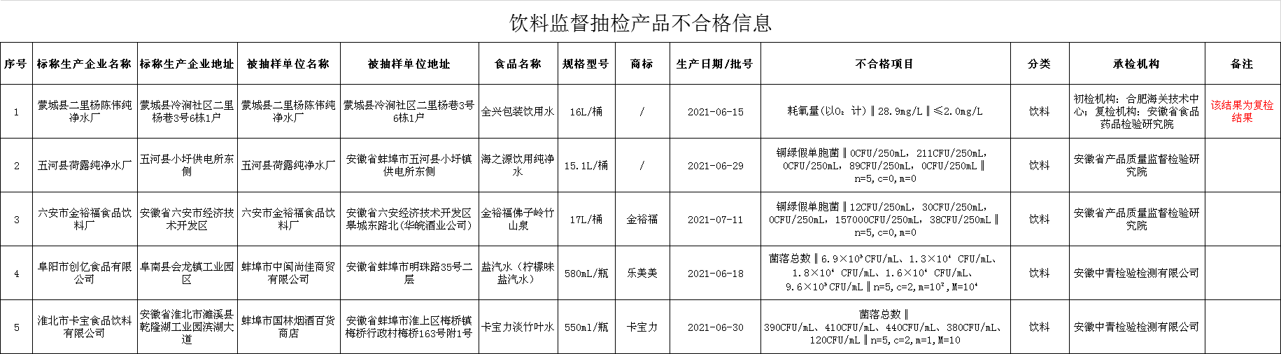 (五)标称蚌埠市五河县荷露纯净水厂生产的海之源饮用纯净水,铜绿假单胞菌不符合食品安全国家标准。检验机构为安徽省产品质量监督检验研究院。