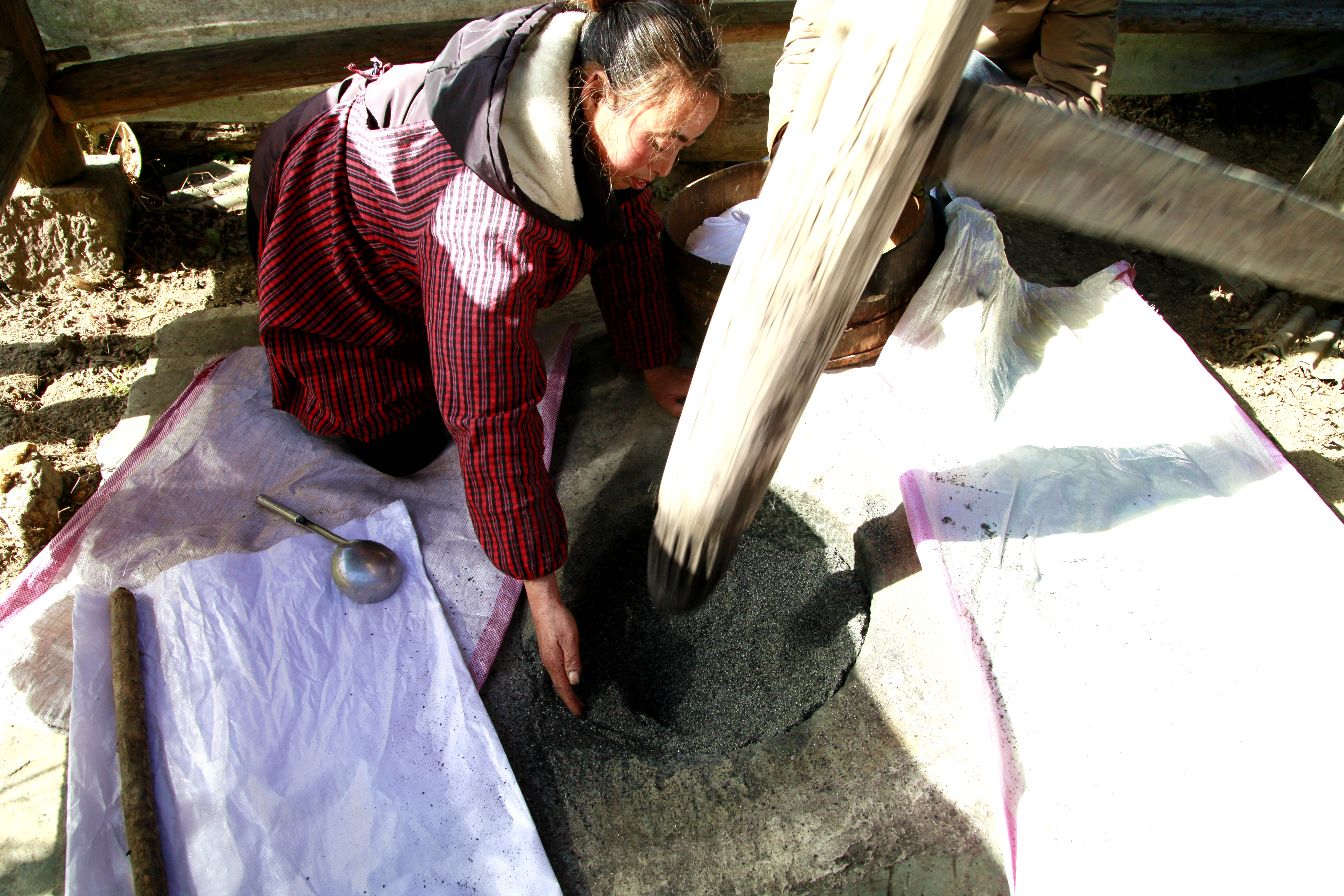“炒熟的芝麻冷却后,要在石臼里舂碓近一个小时,再加入适量事先准备好的糖粉,经过4000多次的舂碓翻滚,直到芝麻粉和糖粉融为一体出油结团,用手一抓成型不散,才能确保舂碓出的芝麻糕保持了原始醇香、油润、酥糯可口。”年近50岁的村民汪兰香“大师”欣喜地告诉我们。“芝麻糕特别好吃,我从小吃到大,每年过年我们这家家户户都要做芝麻糕,我都做了20多年了。”