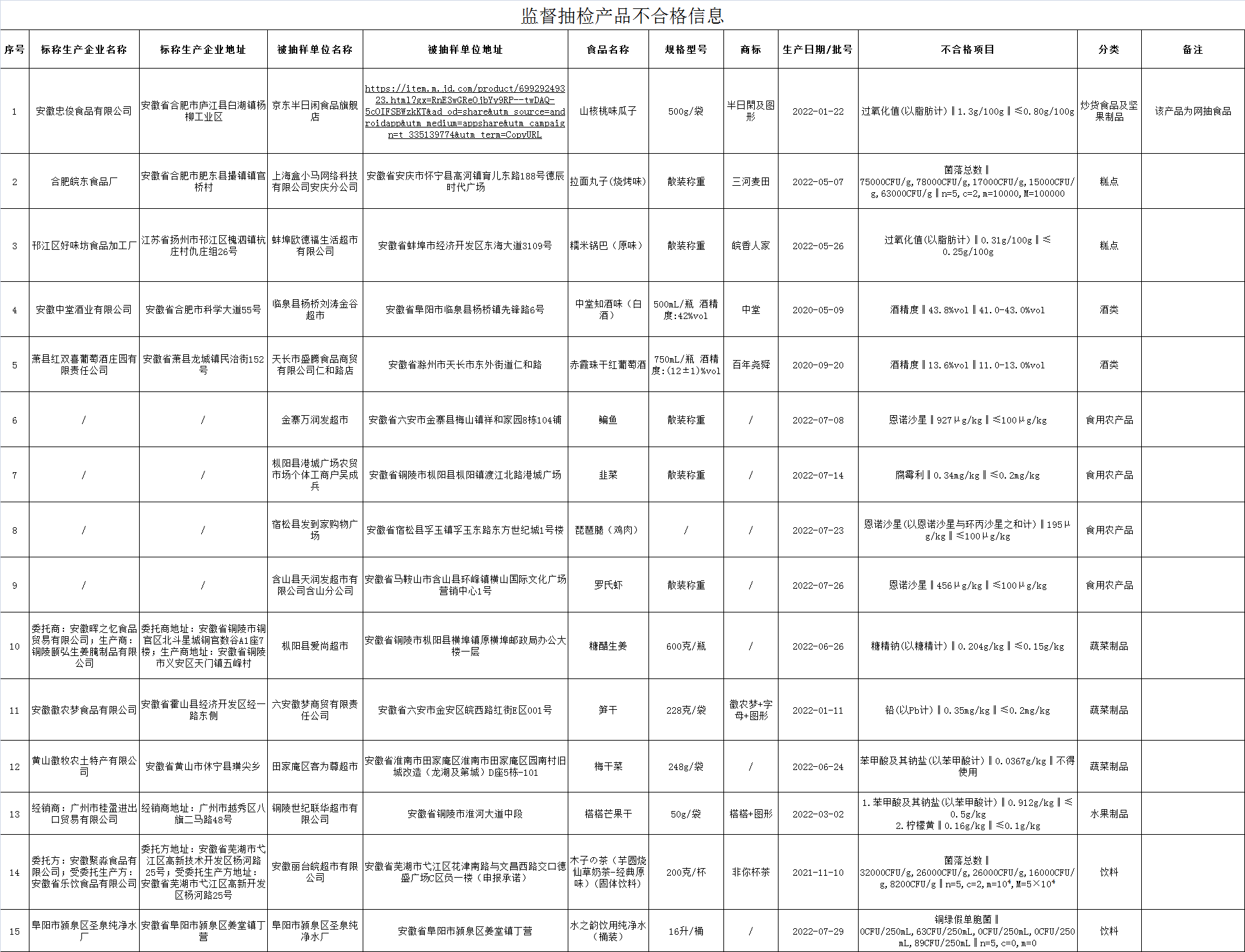 9月28日,安徽省市场监督管理局发布2022年第38期食品安全抽检信息,安徽省市场监督管理局组织抽检炒货食品及坚果制品、糕点、酒类、肉制品、食用农产品、蔬菜制品、水果制品、饮料、餐饮食品、粮食加工品、乳制品、水产制品、水果制品等13类食品1018批次样品。根据食品安全国家标准、产品明示标准和质量要求检验和判定,其中抽样检验项目合格样品1003批次、不合格样品15批次。