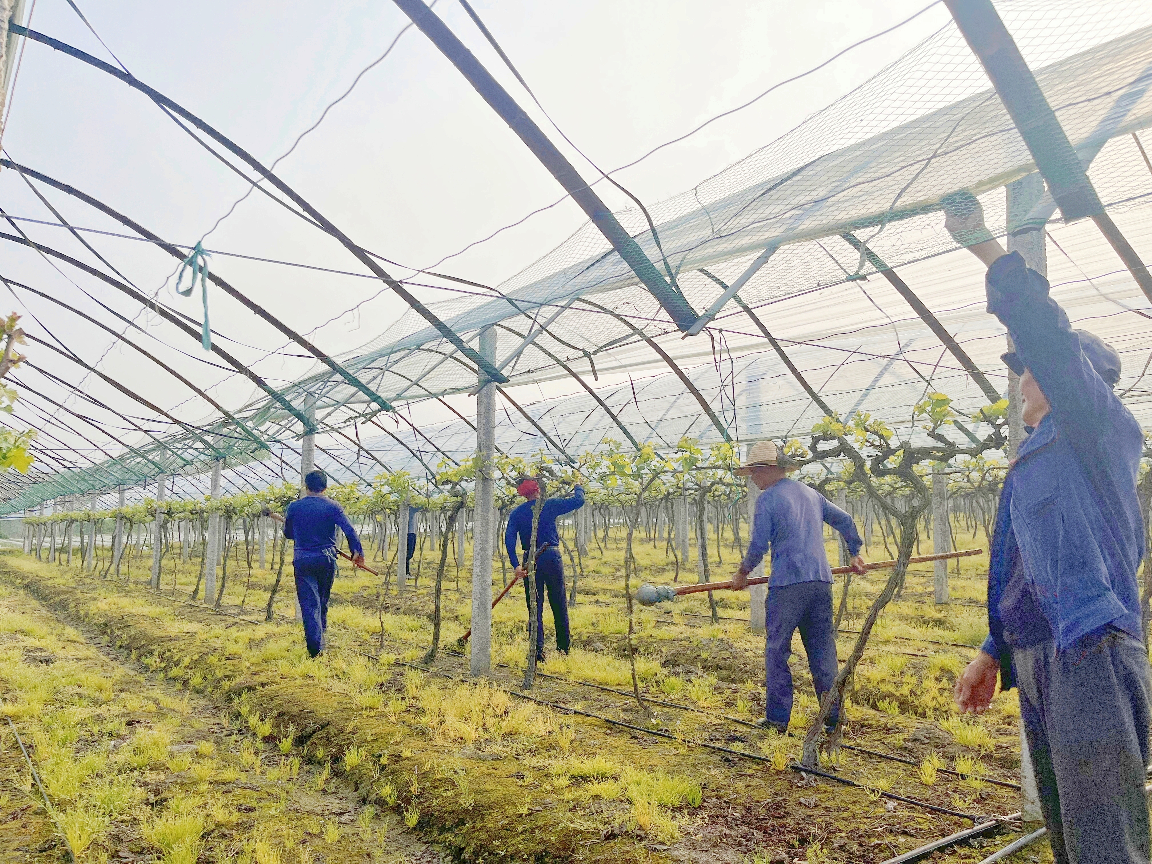 眼下正值葡萄发芽季节,连日来,在休宁县齐云山镇典口村春雨葡萄园的种植基地,果农们正抢抓春季果园管理,铺设新的塑料薄膜,预防雨淋,促成葡萄生长。同时,果农们也忙于对葡萄进行绑枝、抹芽、梳果,为7月采摘葡萄打下基础。