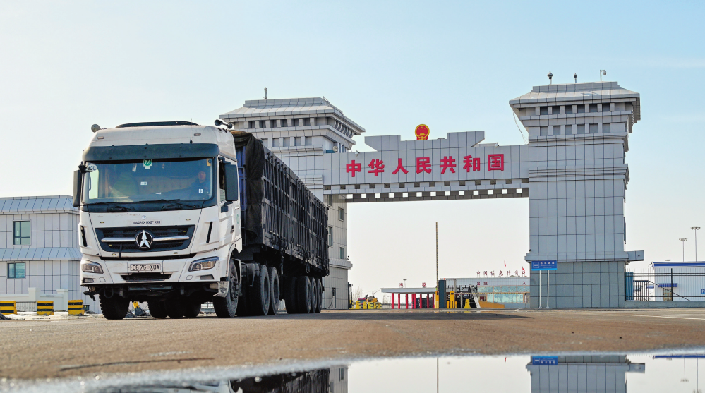 在新疆塔克什肯口岸,运输车辆在 通过国门(2024 年 3 月 13 日摄) 陈朔摄 / 本刊