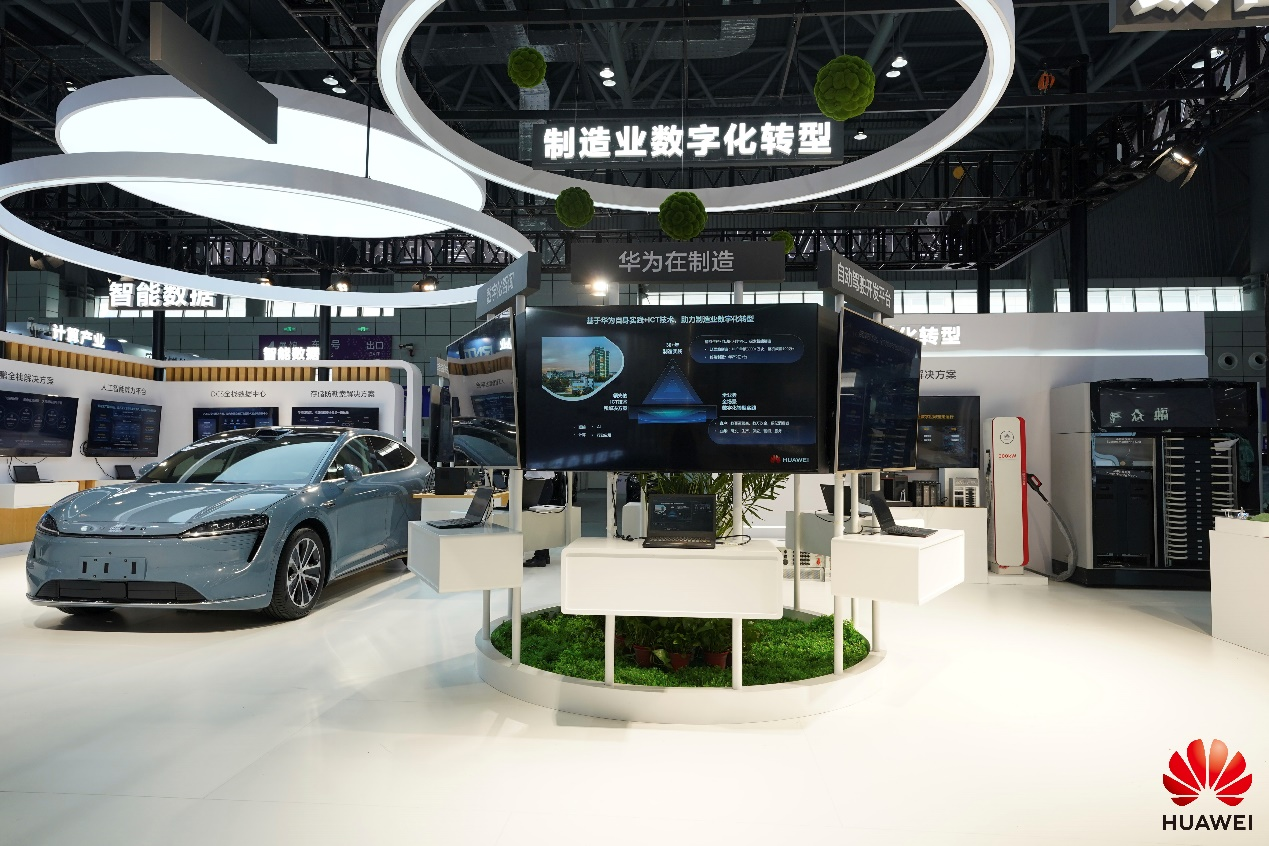 AI能为制造业提供一套从微观到宏观的自动化手段,让制造企业的运行效率在数字化基础上更进一步。这一轮由AI牵引的技术变革,被称之为数智化。与上一轮数字化转型一样,数智化转型同样需要顶层设计的牵引和方法论的指导,也需要底层面向具体业务和场景的产品及解决方案支撑。二者相辅相成,制造业的AI实践与数智化转型才能目标清晰、高效落地。本次华为展台展示的主要内容正是围绕方法论和具体解决方案来展开。“源于制造,更懂转型“,华为提供了制造业数智化转型、数智车企、数智半导体、计算产品及方案等模块,向观众介绍了华为在制造业中的实践。