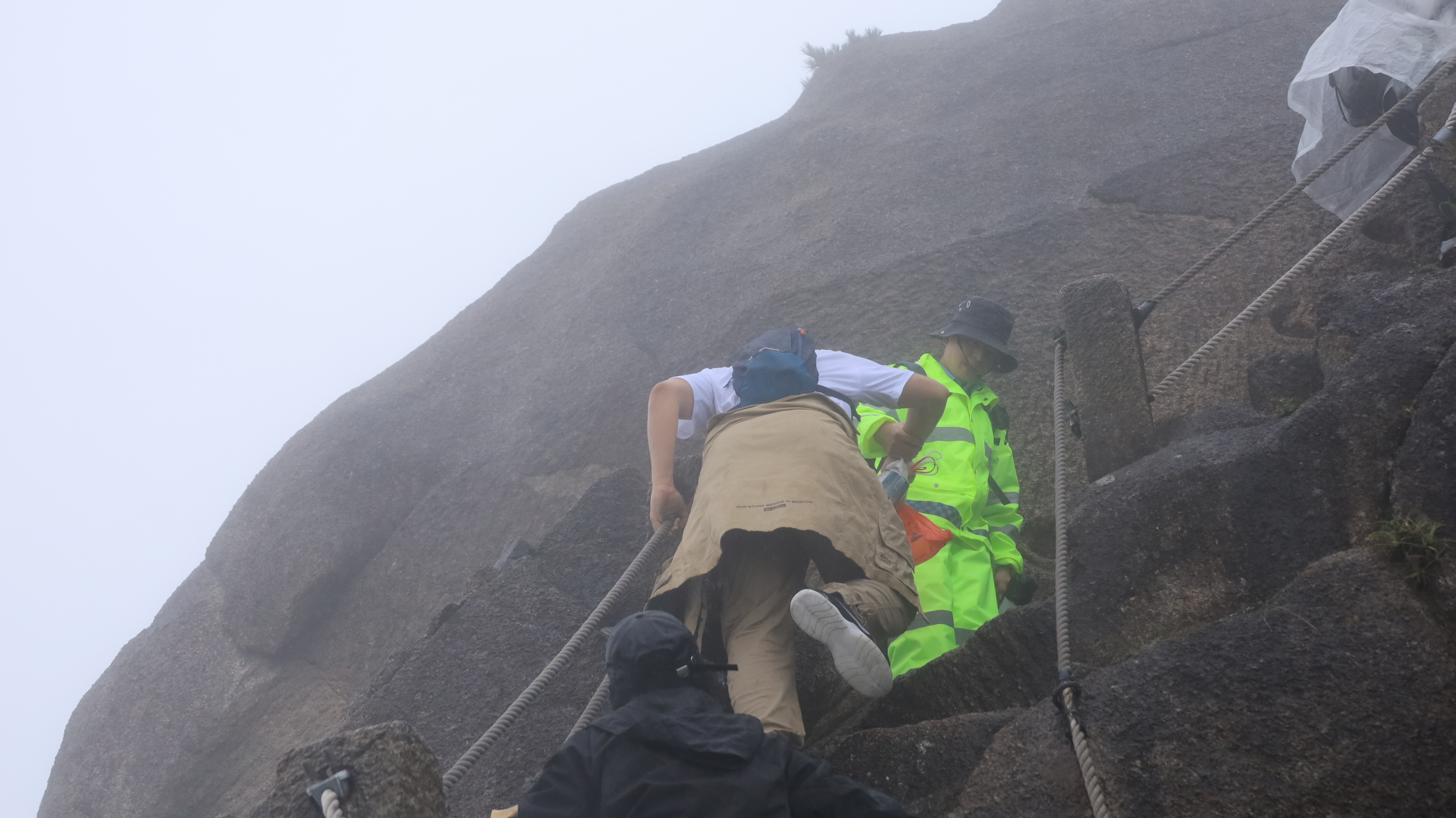 鲫鱼背是一条长10余米,宽仅1米的石矼,有着“一夫当关、万夫莫开”之势。石矼两侧是千仞悬崖,深邃莫测,其形颇似出没于波涛之中的鲫鱼之背,故名鲫鱼背。“这是从老道口登上峰顶的必经之路,加上奇险无比,现在已经成为大家必打卡的景点,因此我们要尤为关注游客安全。”程晴国作为一名综合治理队员,去年也是“莲花峰小哥”的一员,对于他而言,变化的是地点,不变的是肩上责任。