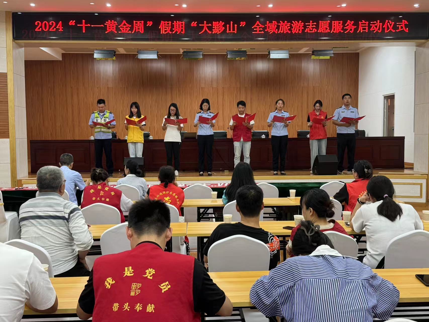 启动仪式上,“大黟山”全域旅游党员、巾帼、青年、交通、文旅、公安、市监、小宏帽等8支特色志愿服务队代表,向全县“大黟山”全域旅游志愿者发出倡议,在各自志愿服务岗位上,为游客提供热情引导、热心相助、秩序维护等志愿服务,随后传递了“大黟山”全域旅游志愿服务队队旗,并在2024“十一黄金周”假期“大黟山”全域旅游志愿服务启动仪式横幅上留下签名,承诺从自身做起,为全域旅游志愿服务助力,唱响 “黟见倾心、自在桃源,志愿服务、你我同行” 主旋律。
