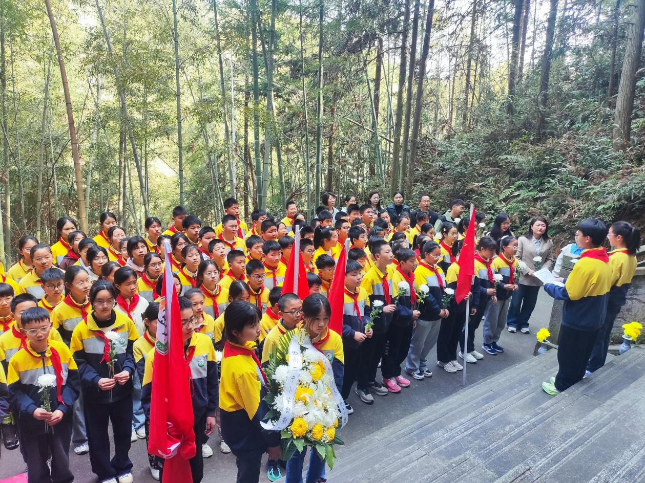 在小练烈士陵园,全体师生整齐列队,面向烈士墓碑唱响爱国歌曲,用激昂的旋律表达对革命先烈的崇高敬意。少先队员代表庄重地向烈士敬献花篮和菊花,全体人员肃立默哀、鞠躬致敬,以最真挚的情感缅怀英雄。在“小练惨案”纪念碑前,讲解员深情讲述1930年至1933年间革命先烈浴血奋战的英勇事迹,通过真实的历史细节,让队员们深刻感受到今日和平的来之不易。活动最后,全体少先队员右手握拳,重温入队誓词,铿锵有力的誓言在陵园上空回荡,表达了新时代少年继承先烈遗志、奋发图强的坚定决心。