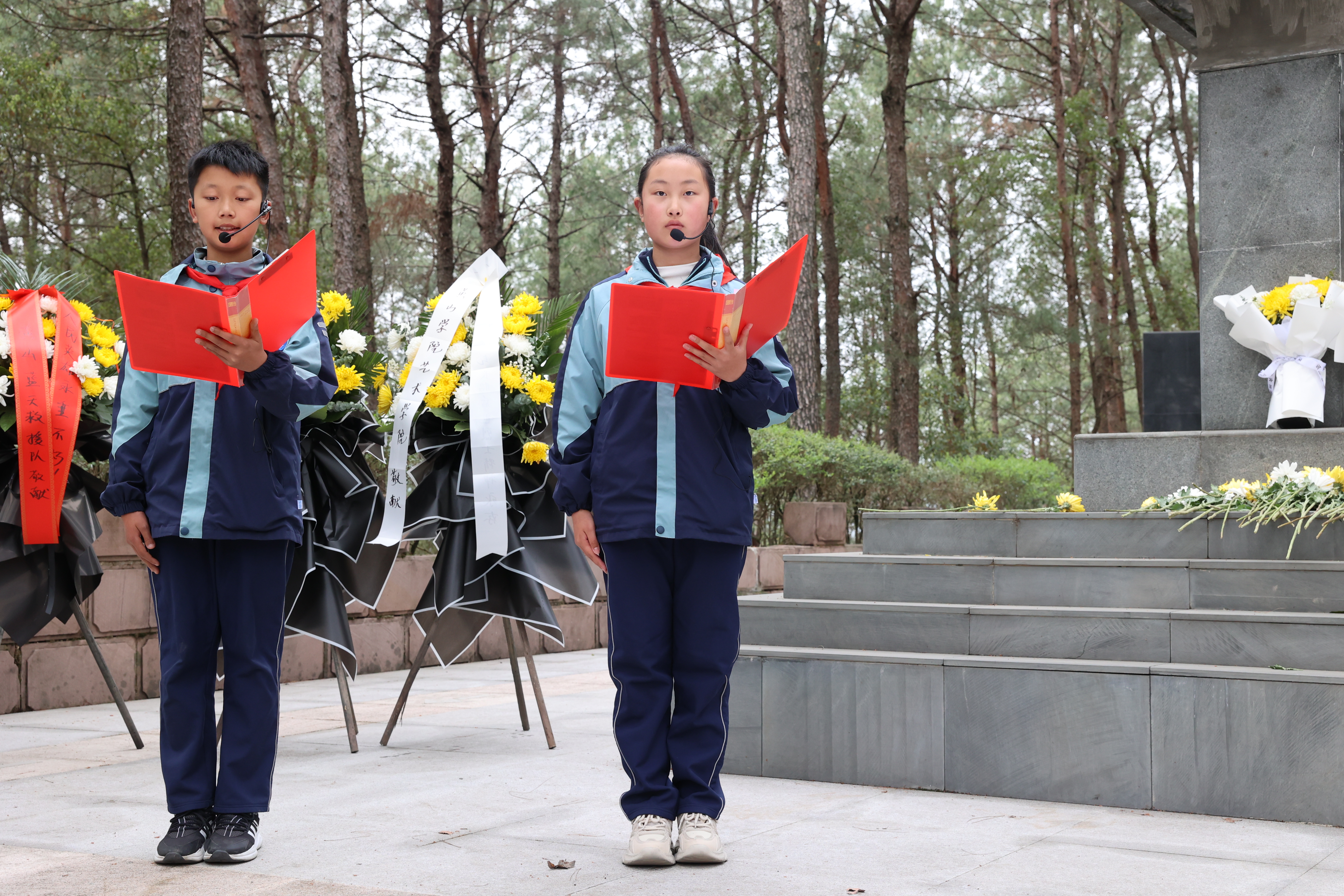 烈士陵园庄严肃穆,苍松翠柏掩映着纪念碑。全体师生心怀敬意、庄重严肃地站在纪念碑前,将自己对英烈们的敬意唱响在国歌之中。随着《我们是共产主义接班人》的旋律响起,全体少先队员挺直脊梁,在嘹亮的歌声许下“强国有我”的青春誓言。