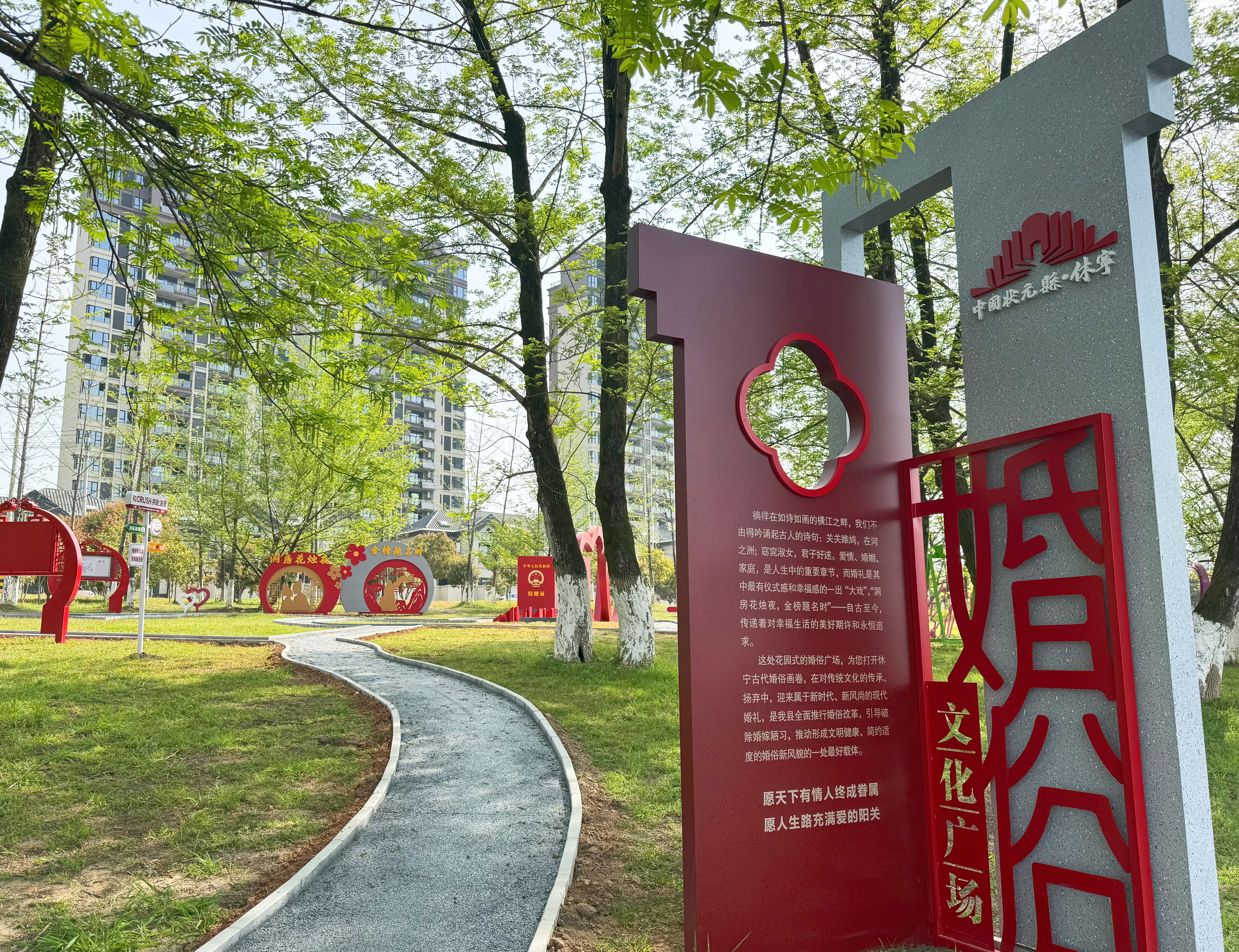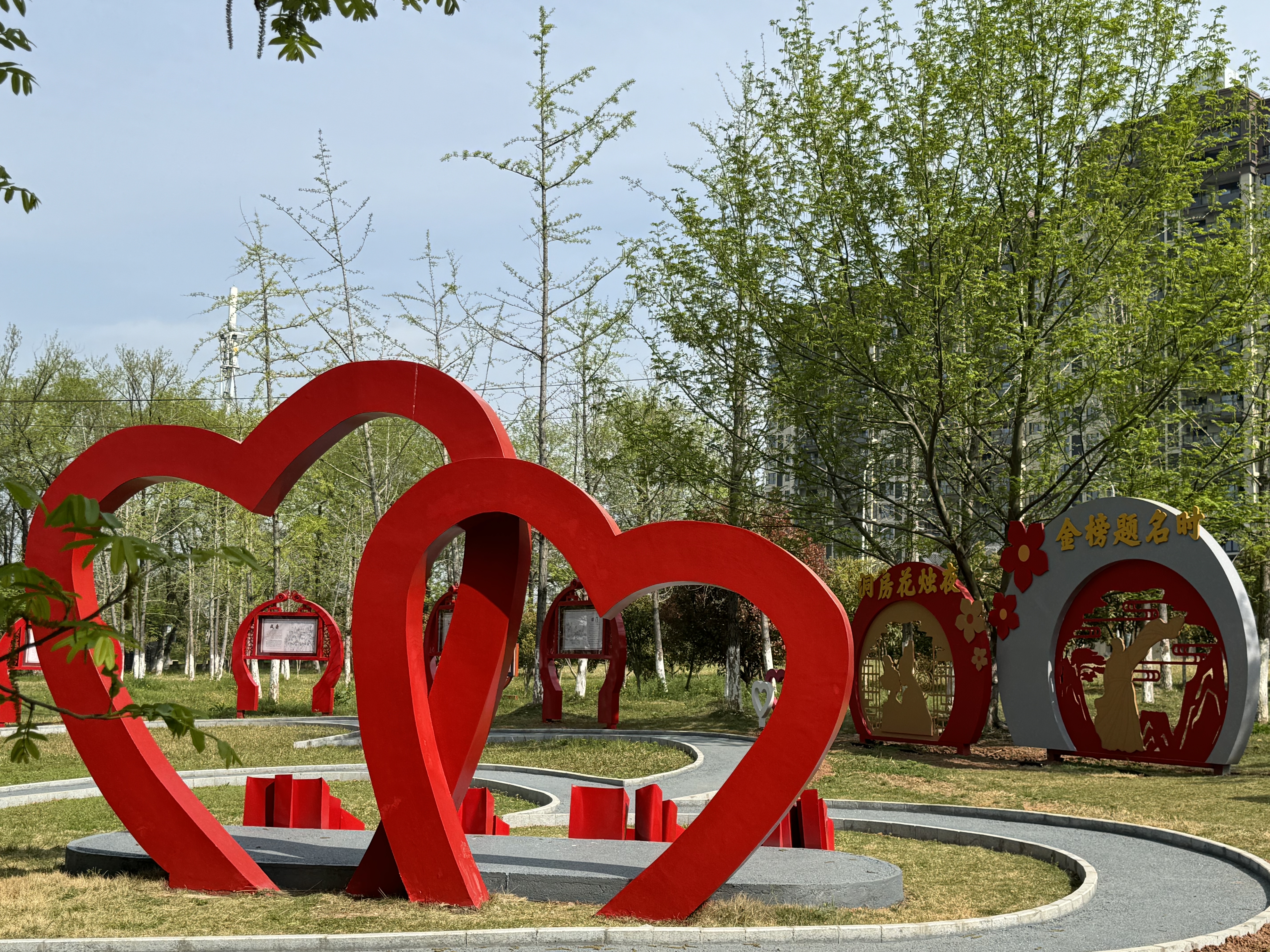 走进占地约700平方米的户外颁证基地,醒目的大红色双爱心造型与婚俗宣传主题完美契合,草地上,古代婚俗礼仪系列展板、新婚俗展示牌、结婚誓词牌、爱情拱门等新颖元素的加持,更是为横江公园增添亮点。