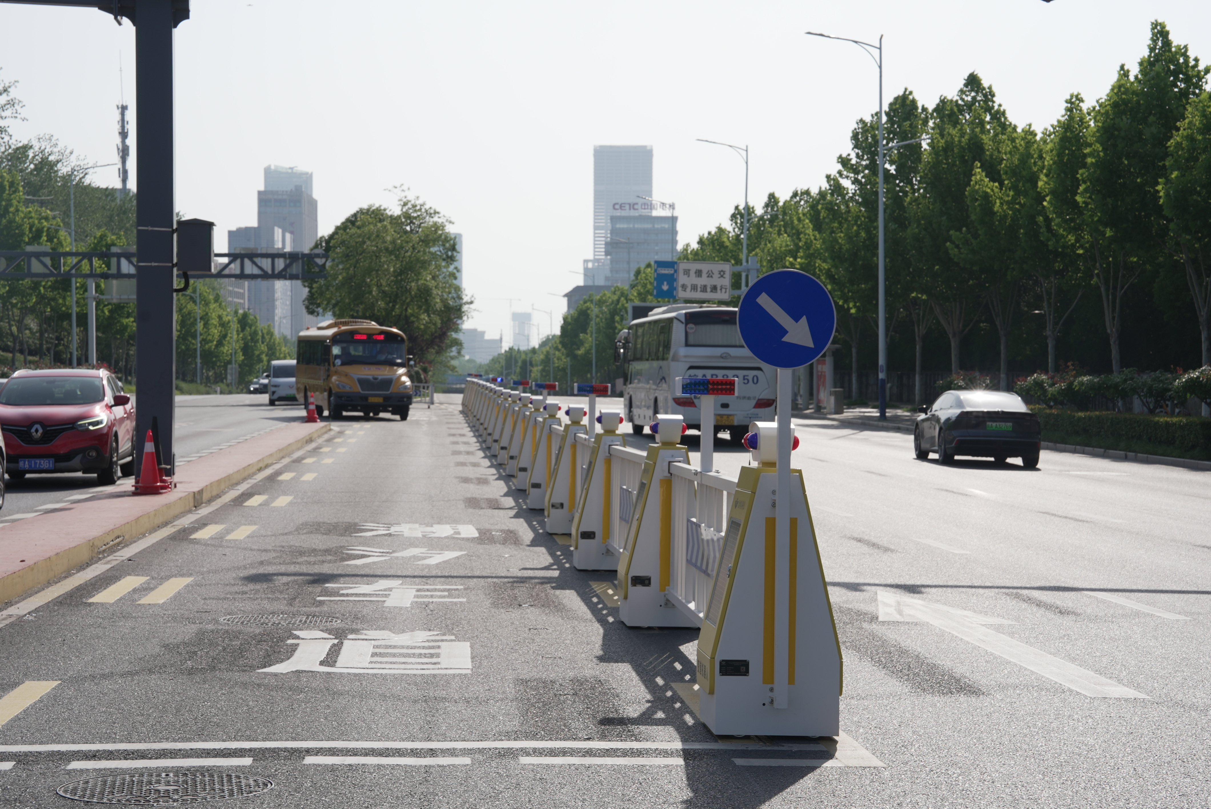 随着晚高峰的到来,望江西路与枫林路交口西向东方向可变车道的指示牌亮起,变道机器人实时启动,一起向北方向移动。仅40秒,便将对向的一个车道括进西向东方向,作为左转车道使用。平峰时段,这些变道机器人则会自动回靠至道路中分带,道路恢复常规的通行秩序。