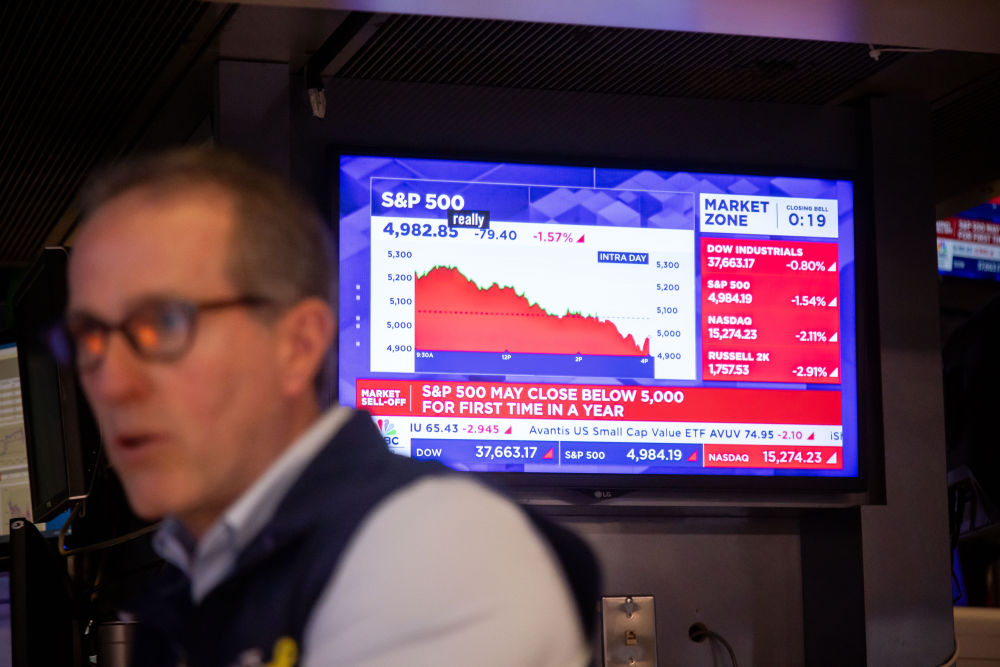 4月8日,交易员在美国纽约证券交易所交易大厅工作。纽约股市三大股指8日下跌。新华社发(郭克摄)