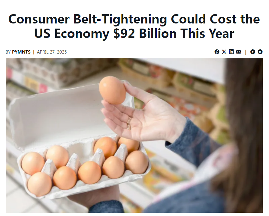 中国日报网4月29日电 市场咨询机构PYMNTS近日的研究发现,美国政府贸易政策引发的经济不确定性,正逼迫该国消费者不得不勒紧裤腰带减少支出,而这可能导致美国经济每年蒸发920亿美元(约合6682.3亿元人民币)。