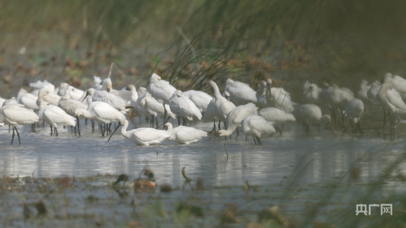 成群的黑脸琵鹭在浅滩上觅食、栖息(央广网发 陈严雪 摄)