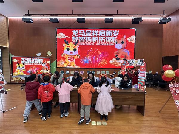 1 月 28 日下午,黄山市屯溪龙山实验小学的报告厅与操场上一片欢腾,处处洋溢着童趣与年味。一年级的萌娃们身着喜庆服装和汉服,小脸神采奕奕,迎来了专属他们的 “龙马呈祥” 主题趣味无纸化测评。这场别开生面的闯关挑战,紧扣 “双减” 育人要求,将语文、数学、音乐、体育、美术等学科知识,巧妙融入六大趣味关卡,让孩子们在欢声笑语中闯关答题,在趣味挑战中检验学习成果,沉浸式收获成长的喜悦。