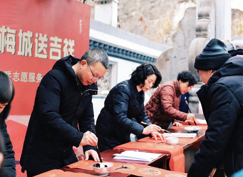 文峰南路祁门二中门口, “送春联”活动现场墨香四溢。一群热爱书法的青少年在指导老师的带领下,屏息凝神,挥毫泼墨。笔锋流转间,一个个饱满的“福”字、一幅幅寓意吉祥的春联跃然纸上。“四季平安原是福,一堂和煦便成春”“祁红香溢千门喜,梅城春融万户新”……既有传统佳句,也有融入本地茶文化特色的创新联对。师生化身志愿者,将承载着祝福与敬意的春联送给社区居民、来往行人。让青少年在服务中理解责任,在付出中感受快乐。
