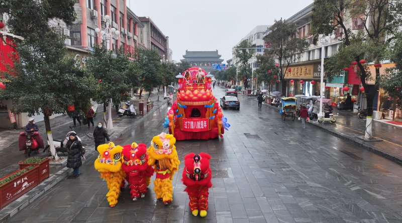 活动现场,非遗盛宴率先点燃节日氛围。列入省级非物质文化遗产名录的寿州锣鼓铿锵作响,钢锣的洪亮清脆与钹鼓的激扬舒缓交织,将南北锣鼓艺术的精髓展现得淋漓尽致。紧随其后的舞狮巡游踩街而行,红黄狮身点缀古城街巷,与围观市民的欢声笑语相映成趣。当仪式现场一声嘹亮的“春来了!”划破长空,瞬间拉满新春氛围。书法家们挥毫泼墨,一幅幅“福”“寿”大字带着墨香赠予市民,让千年福寿文化在笔墨流转中焕发新生。