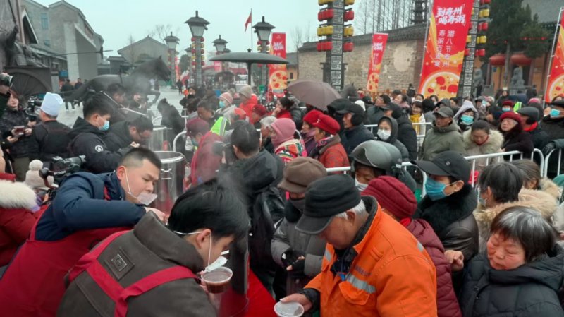 三列领粥通道前井然有序,2000份热气腾腾的寿粥免费派送,米香与食材的醇厚香气弥漫在春申坊的每一个角落。这碗凝聚着古城心意的寿粥,不仅延续了寿县“民多长寿”的历史传统,更承载着对老者安康、市民幸福的美好期许。