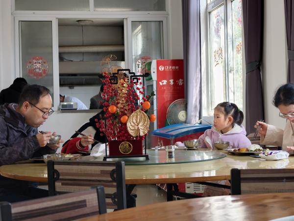 暖心食堂飘香气,烟火年味暖人心。延续往年深受好评的服务模式,宏村镇暖心食堂在春节期间正常开放,精心推出亲民实惠的10元暖心套餐,五菜一汤荤素搭配,涵盖五加皮炒蛋、笋衣烧肉等地道徽菜,既保障了饮食安全,又让群众以实惠价格品尝到徽州风味。食堂内暖意融融、座无虚席,返乡老人、环卫工人、过往游客围坐一堂,同吃暖心餐、共话家常事。“五菜一汤只要十元,食材新鲜还都是地道徽味,在景区能吃到这么实惠暖心的饭,太惊喜了!”来自上海的游客孙女士一边用餐一边感慨,“听说往年就有这个暖心食堂,特意来体验,果然名不虚传,这顿饭吃出了家的味道。”另一位带着孩子的游客也笑着说道:“带着娃逛景区最怕吃饭不方便,这里的套餐荤素搭配,孩子吃得香,我们也省心,为宏村的暖心举措点赞!”热气腾腾的饭菜驱散了冬日寒意,也凝聚起邻里相伴的温情,处处洋溢着团圆祥和的节日氛围,成为宏村春节最动人的烟火符号。