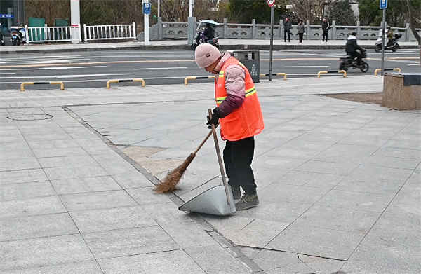 程雪香是一家保洁公司的环卫工人,负责着两个小区及路段的保洁工作。过年这段时间,她每天依旧身着统一工装,手持扫帚、簸箕,弯腰俯身对负责区域进行全面清扫,纸屑、杂物被逐一清理干净,不留任何死角。“我们要及时把自己负责的区域垃圾及时清运掉,把周边环境打扫得干干净净的,保护好我们的生态,让大家安安心心、快快乐乐过新年。”虽然辛苦,但她无怨无悔。
