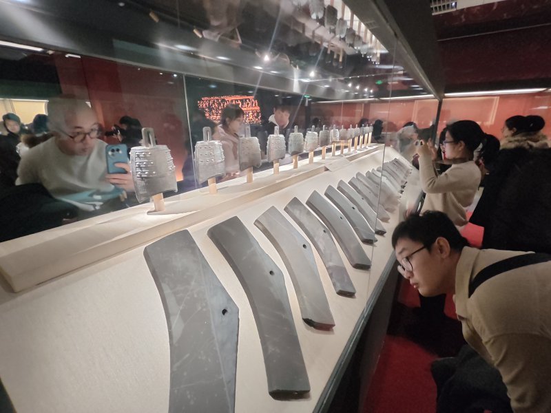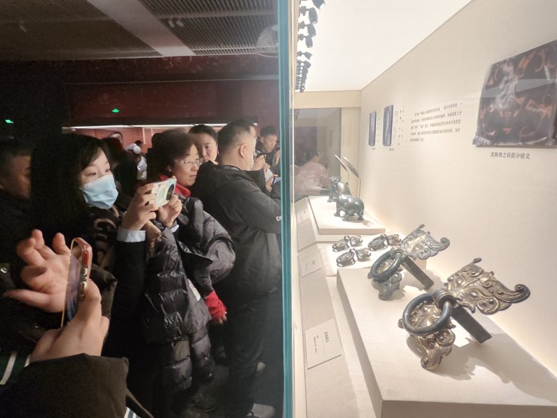 此次展出的一套完整九鼎八簋的青铜礼器组合,彰显着楚国最高等级的丧葬配置,每天都有众多游客前来观赏。