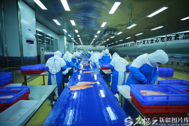 新疆天蕴有机农业有限公司三文鱼深加工厂,工人在加工三文鱼。赵学林摄(资料图)