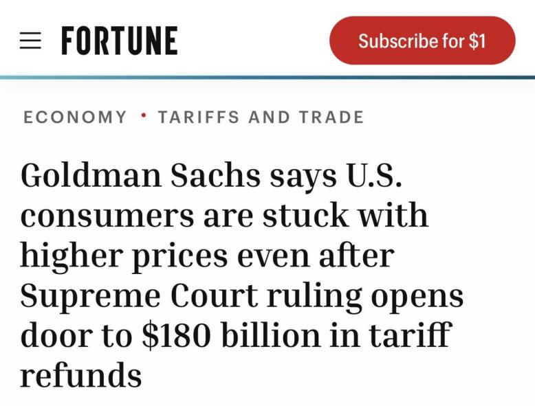 高盛认为,美国联邦最高法院做出裁决之后,美国消费者能够节省自身开支的可能性很小,这在很大程度上是因为特朗普政府又依据《1974年贸易法》第122条款,征收“全球进口关税”,税率起初为10%,仅仅一天后就提高到了15%。