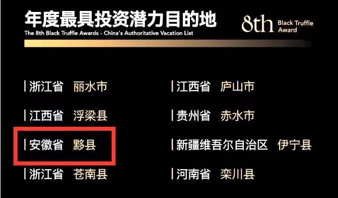 3月20日,在第三届全国民宿产业发展大会暨借宿大会第八届黑松露奖领奖盛典暨庐山民宿产业发展大会上,黟县荣获第八届黑松露奖年度最具投资潜力目的地。