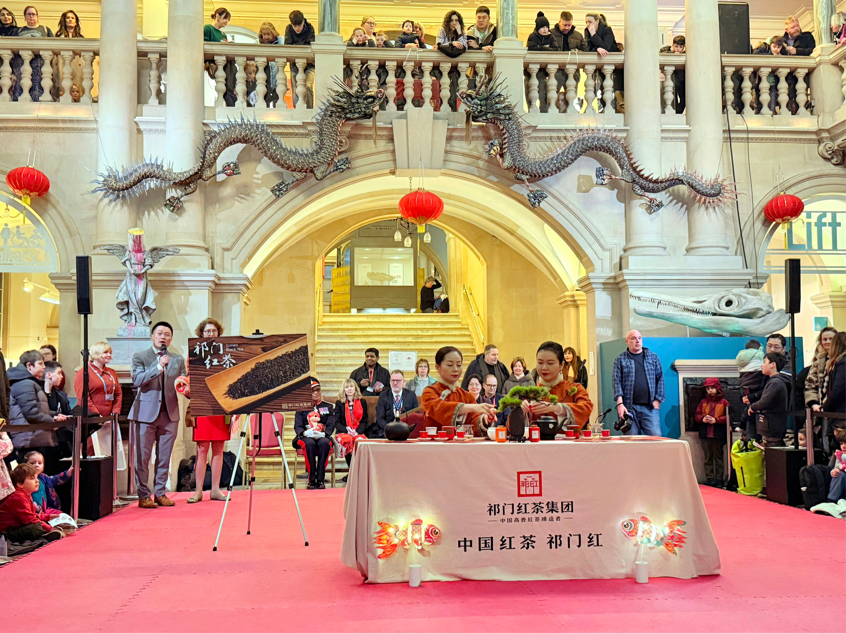 在非遗展区,祁门红茶集团以茶为媒,通过中国结、春联等满是“年味儿”的文化产品,向观众们展现了春节文化的深厚底蕴,在英伦大地上增添了浓厚的中国风情。这是祁门红茶作为人类非遗首次在新春佳节之际走出国门,参加“欢乐春节”系列活动。