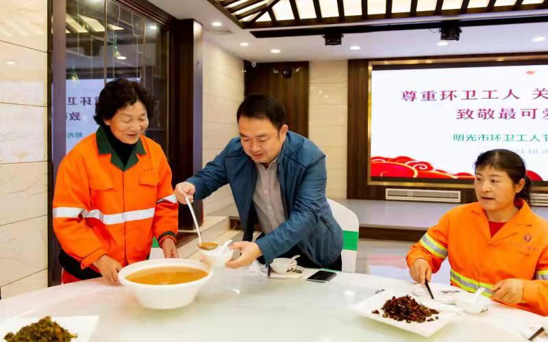 羊肉汤、馒头、蛋炒饭、杂粮粥等各种早点热气腾腾。明光市委副书记、市长张传宗、副市长马殿勇和环卫工人们围坐在一起,边吃边聊,了解环卫工人们的生活、身体和家庭状况。