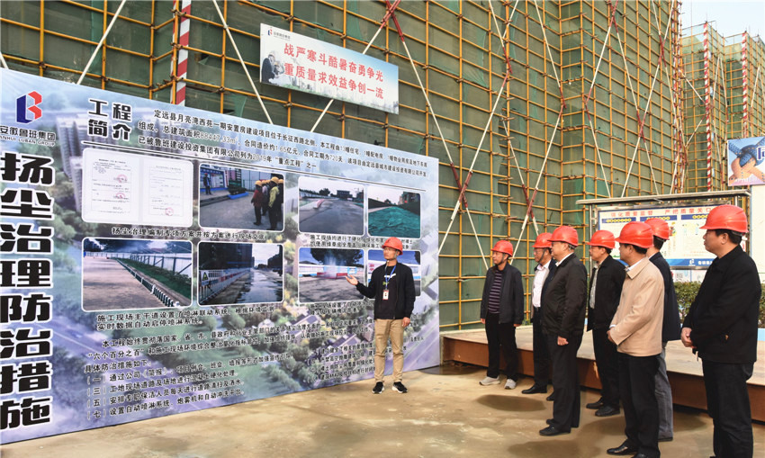 在定远月亮湾西苑一期工程现场,采访团重点调研控尘抑尘情况。工程负责人介绍,这个建筑施工工地做到了工地周边围挡、物料堆放覆盖、土方开挖湿法作业、路面硬化、出入车辆清洗、渣土车辆密闭运输六个“百分之百”。