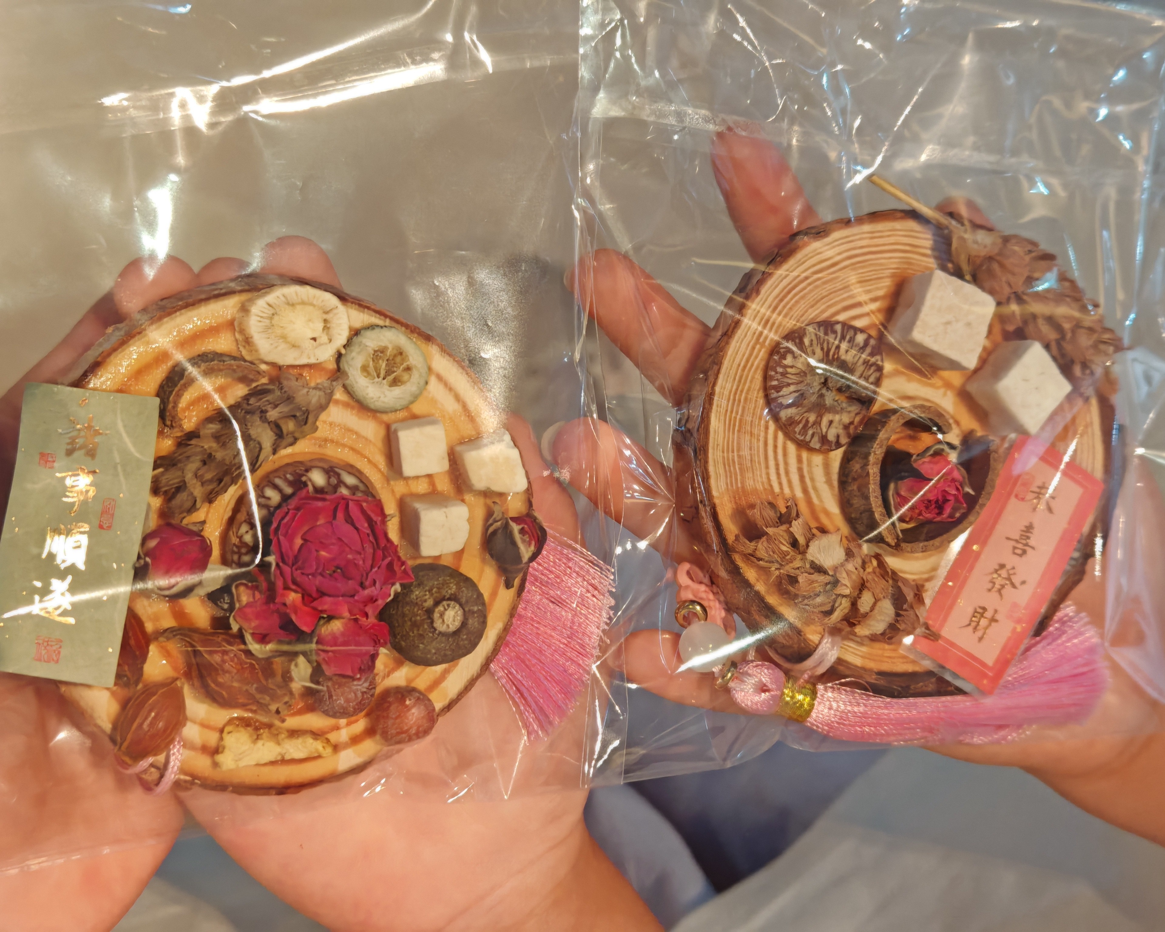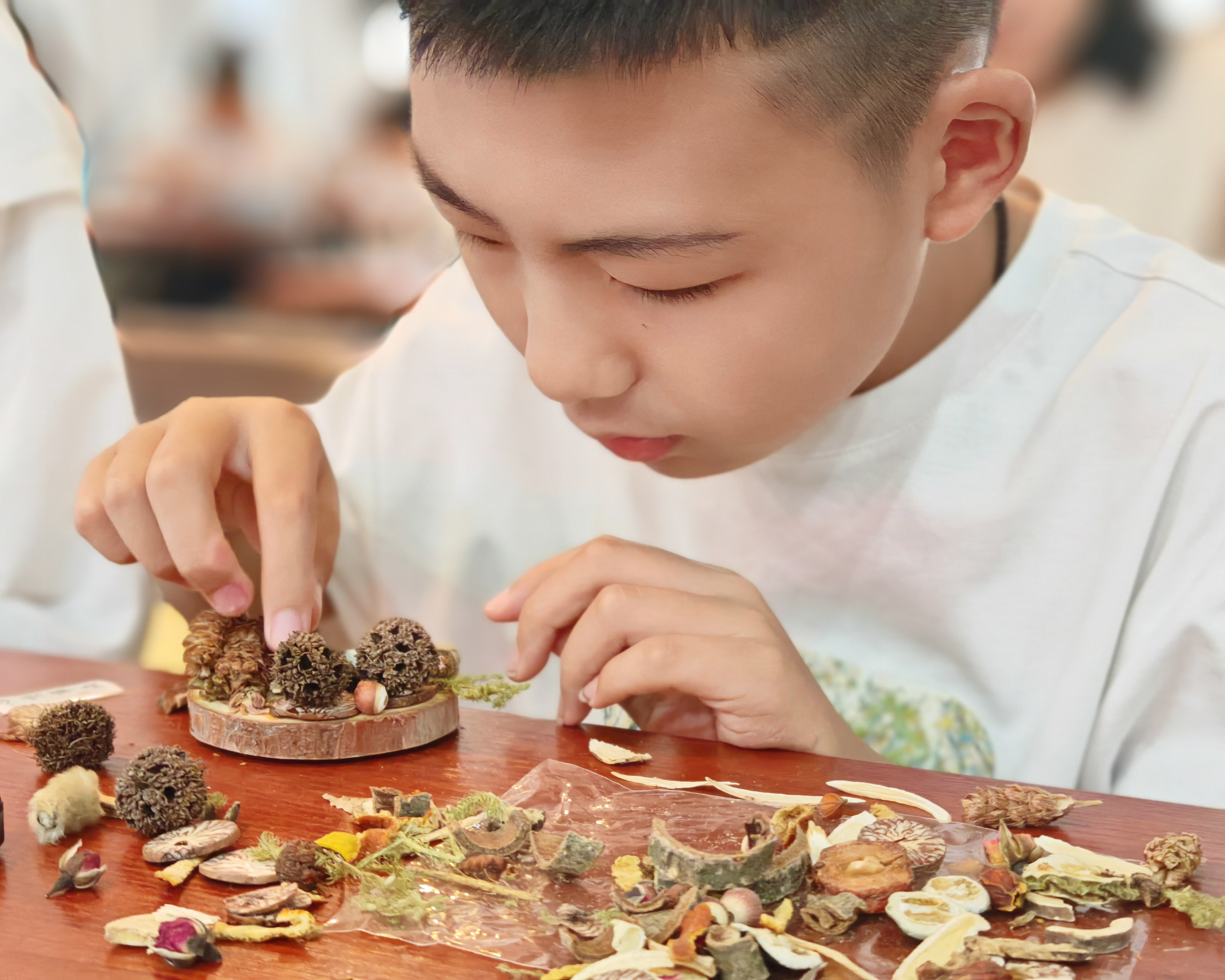 理论科普结束后,手工制作环节正式开始。家长与孩子坐在长桌前,将决明子、白芷等药材融入创作,既保留传统元素又赋予现代审美。孩子们小心选取药材,家长则协助调整布局,现场充满温馨的协作氛围。