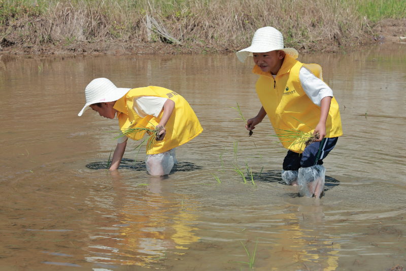 随后,实践环节将活动推向高潮。孩子们在老师和基地工作人员的指导下,有序来到水田边。田埂上,早已按捺不住兴奋的孩子们纷纷挽起裤脚、撸起袖子,小心翼翼地步入了湿润的稻田。面对松软的泥土和青翠的秧苗,一双双稚嫩的小手虽显生疏,却充满了前所未有的认真与专注。他们弯下腰,学习分秧、插秧,将一株株秧苗稳稳地插入泥土中。渐渐地,原本空荡的水田里,一行行、一列列嫩绿的秧苗整齐排列,宛如一个个绿色的音符,在广袤的田野上奏响了生机勃勃的田园乐章。