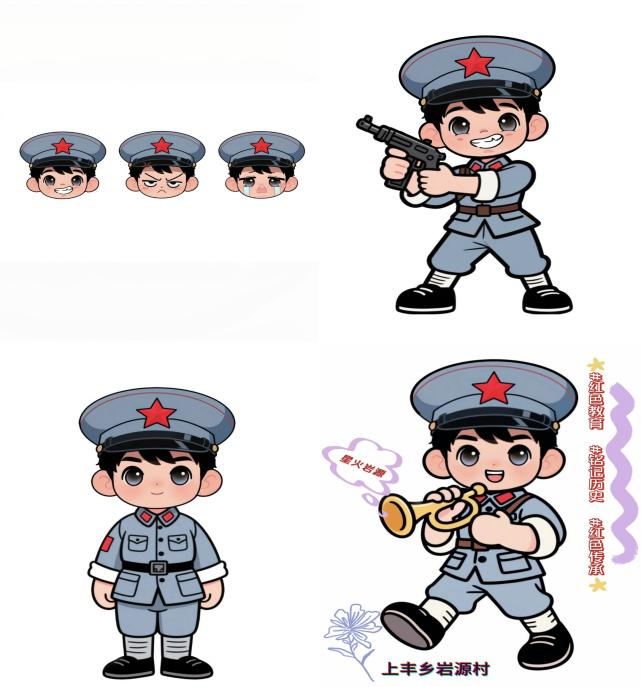 为更好地传承和弘扬抗战精神,实践团结合现代元素,精心设计了一组以革命先烈为原型的IP形象。这些IP形象以红军战士为灵感,身着灰蓝色军装,佩戴领口红星徽章,展现出革命先烈的英勇形象。实践团成员巧妙运用圆润的线条和生动的表情,使形象既保留了历史的厚重感,又富有时代活力;同时,还设计了开心、愤怒等多款生动表情包。这些IP形象将应用于微信表情包、文创产品等多个领域,以年轻人喜闻乐见的方式传播红色文化,让抗战精神在新时代焕发出新的光彩,让红色文化以更活泼的方式走进大众生活。