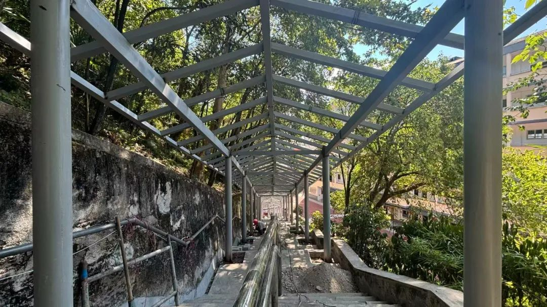 在黄山市实验小学,上山通道的钢构雨棚加装工程同样进展顺利。施工现场,工人们手持焊枪专注作业,主体钢梁已基本架设完成,正按计划推进收尾工作。