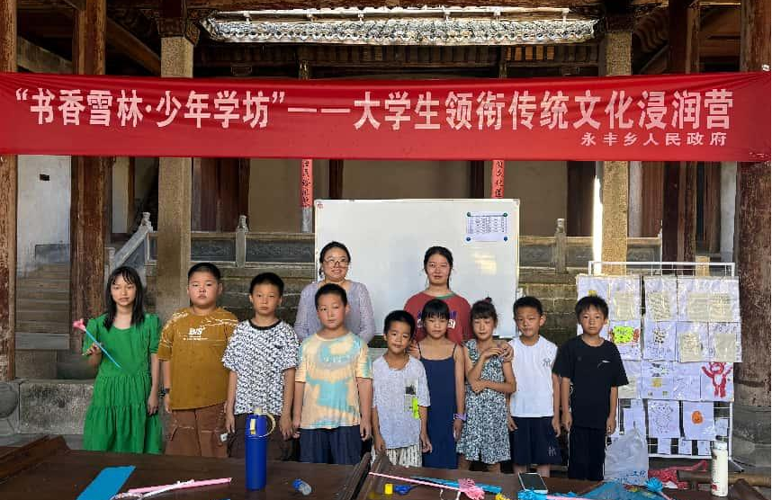 近日,黄山市黄山区永丰乡“书香雪林·少年学坊”大学生领衔传统文化浸润营在苏氏宗祠圆满落下帷幕。为期一个月的活动以传统文化为核心,通过“讲座、实践、创作”三大板块的有机融合,为乡内数十名中小学生打造了一段沉浸式文化体验之旅,给他们带来了别样的暑期体验。