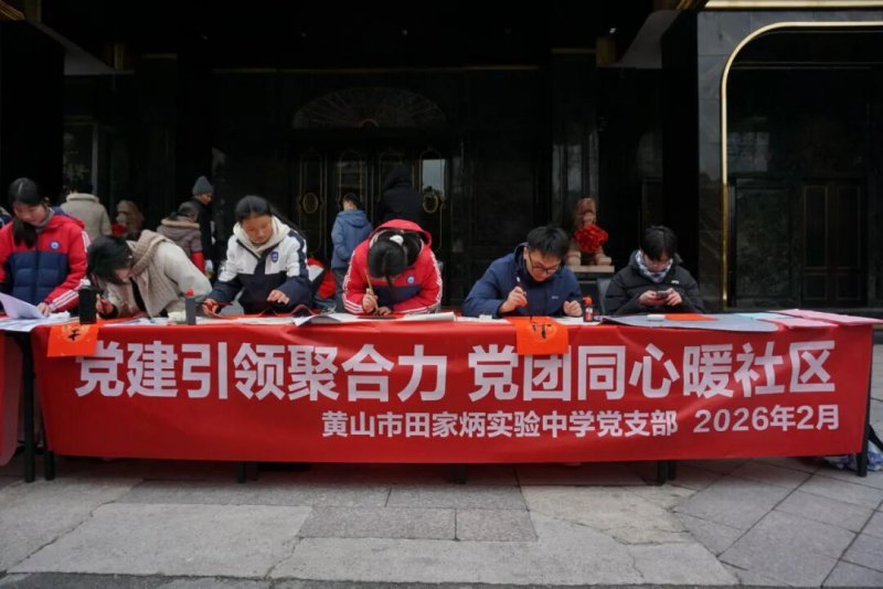 律回春渐,福启新程。为充分发挥校社党组织战斗堡垒作用与党员先锋模范作用,推动党团共建与育人实践深度融合,2月7日下午,黄山市田家炳实验中学联合屯溪区湖边社区,于湖边商城广场开展“翰墨迎新春,党建暖民心”校社联动志愿服务活动。活动以“导-师-制+”为抓手,将文化传承、便民服务与导师育人有机结合,为社区居民送去新春的温暖与关怀。