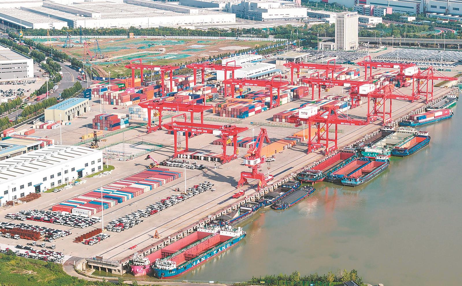 10月31日拍摄的合肥派河港码头,运输货物的车辆往来穿梭,起重机装卸作业有序。今年前三季度,安徽港口集团合肥有限公司货物吞吐量668万吨,同比增长15.8%,集装箱吞吐量41.5万标箱,同比增长7.5%。记者 李博 摄/视觉安徽