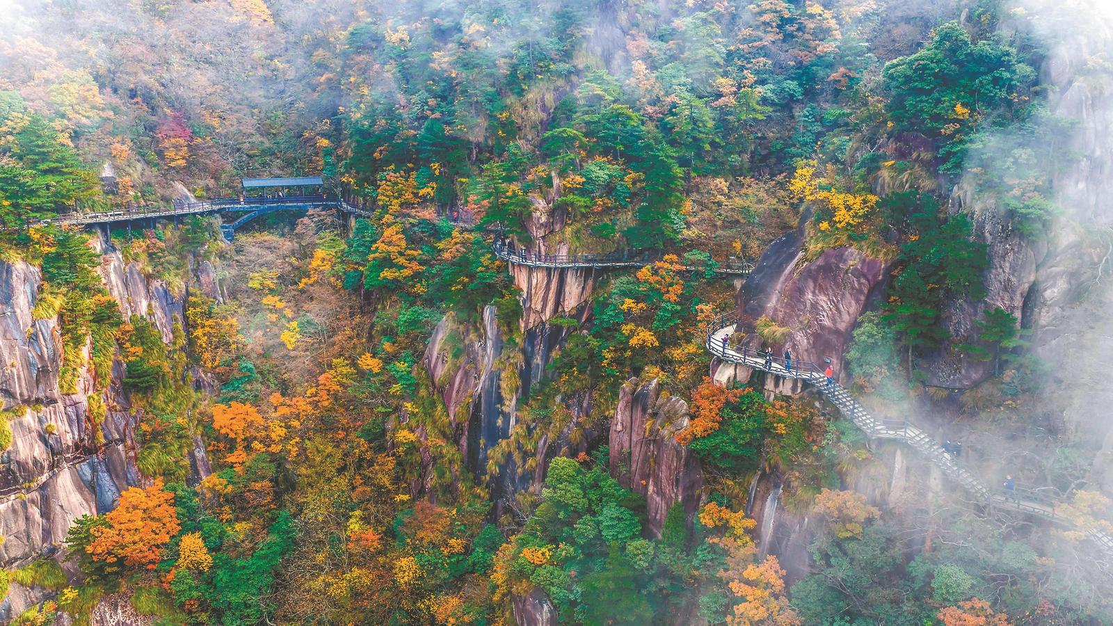 11月11日,游客在池州市九华山风景区花台高空栈道上游玩。通讯员 何清 摄